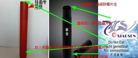 2):在字畫專用筒底部和上部(bù)同(tóng)時放入(rù)梟(xiāo)森防黴片後(hòu)蓋好盒蓋